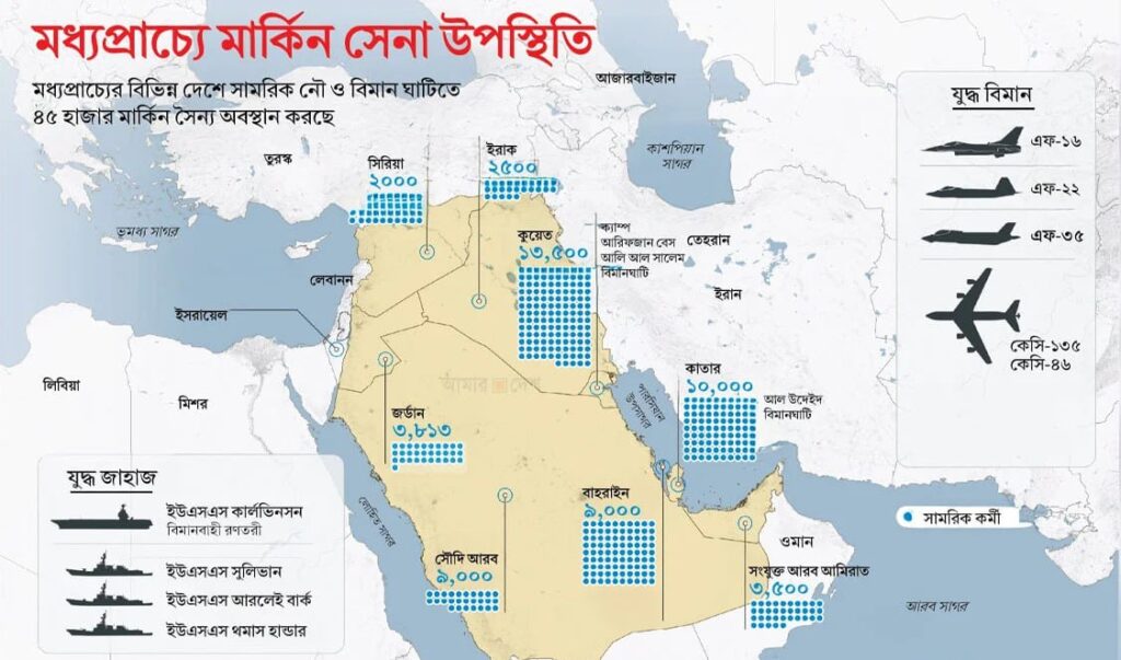 গত কয়েক দশক ধরে মধ্যপ্রাচ্যে শক্ত অবস্থান গড়ে তুলেছে যুক্তরাষ্ট্র। বর্তমানে এই অঞ্চলের অন্তত ১৯টি স্থানে স্থায়ী ও অস্থায়ী ঘাঁটি রয়েছে, যেখানে ৪০ হাজার থেকে ৫০ হাজার মার্কিন সেনা মোতায়েন রয়েছে।