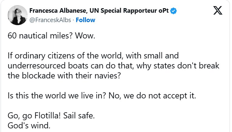 ফিলিস্তিনি অঞ্চলের ওপর নিযুক্ত জাতিসংঘের বিশেষ প্রতিবেদক ফ্রান্সেসকা আলবানিজ প্রশ্ন তুলেছেন যে, বিশ্বের বিভিন্ন দেশ কেন গাজার ওপর ইসরায়েলি সামরিক অবরোধ ভাঙার চেষ্টা করছে না, যেখানে ইসরায়েলের বিরুদ্ধে গণহত্যা ও বেসামরিক নাগরিকদের জন্য কৃত্রিমভাবে দুর্ভিক্ষ তৈরির অভিযোগ রয়েছে। যদি “বিশ্বের সাধারণ নাগরিকরা”, “ছোট এবং দুর্বলভাবে সজ্জিত নৌকা” নিয়ে একটি নৌবহর আকারে গাজা থেকে ৬০ নটিক্যাল […]